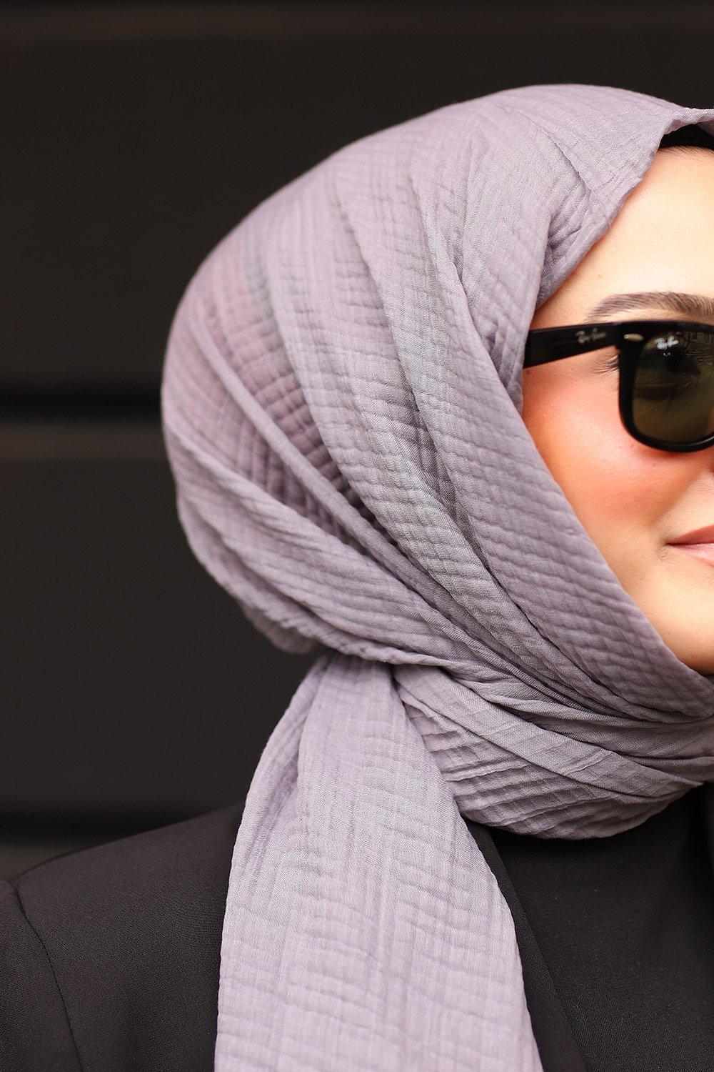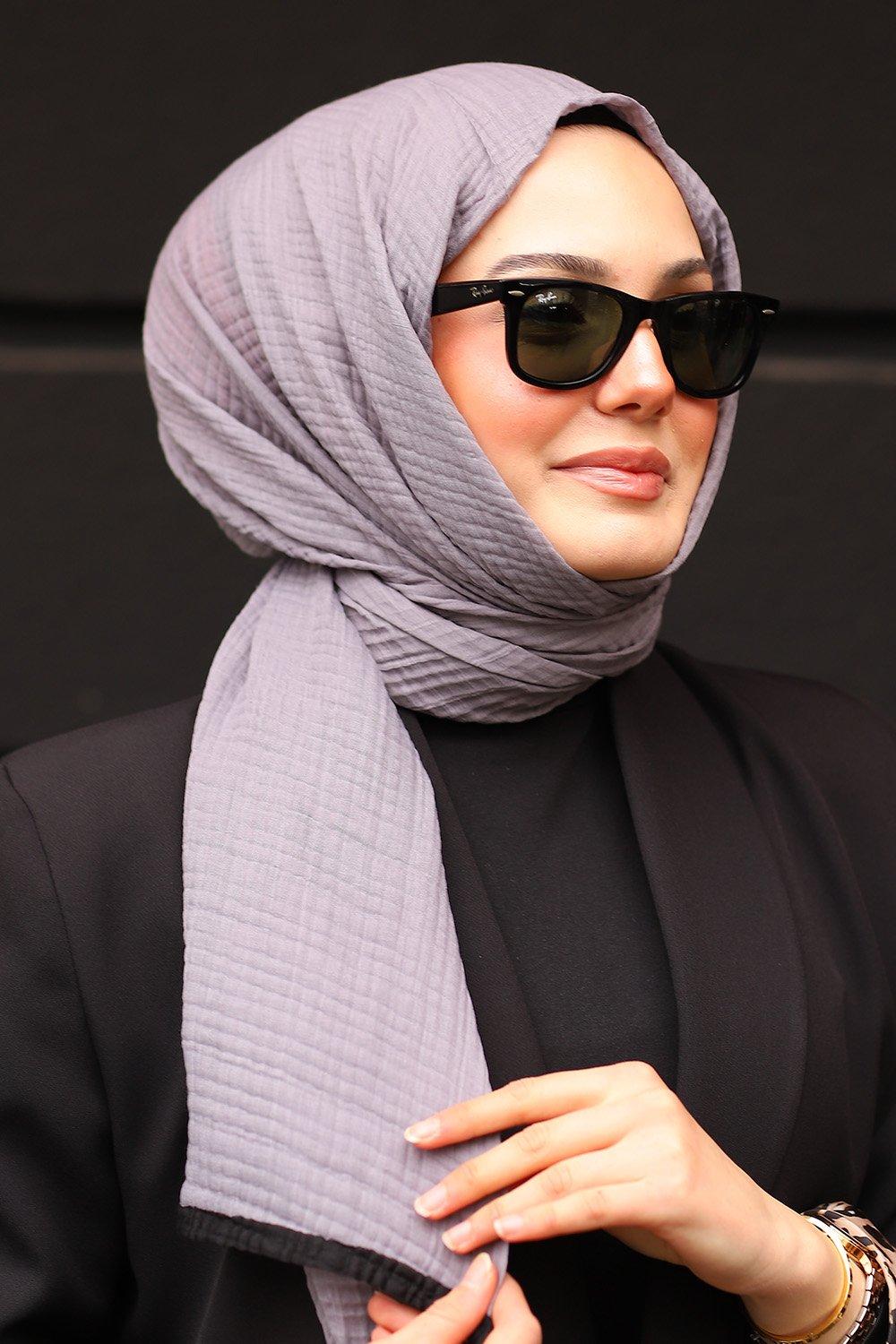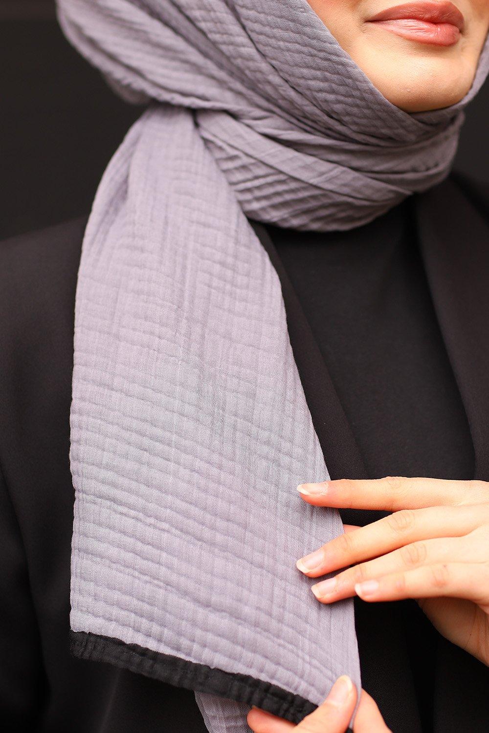 Açık Gri Siyah Premium Müslin Biyeli Şal