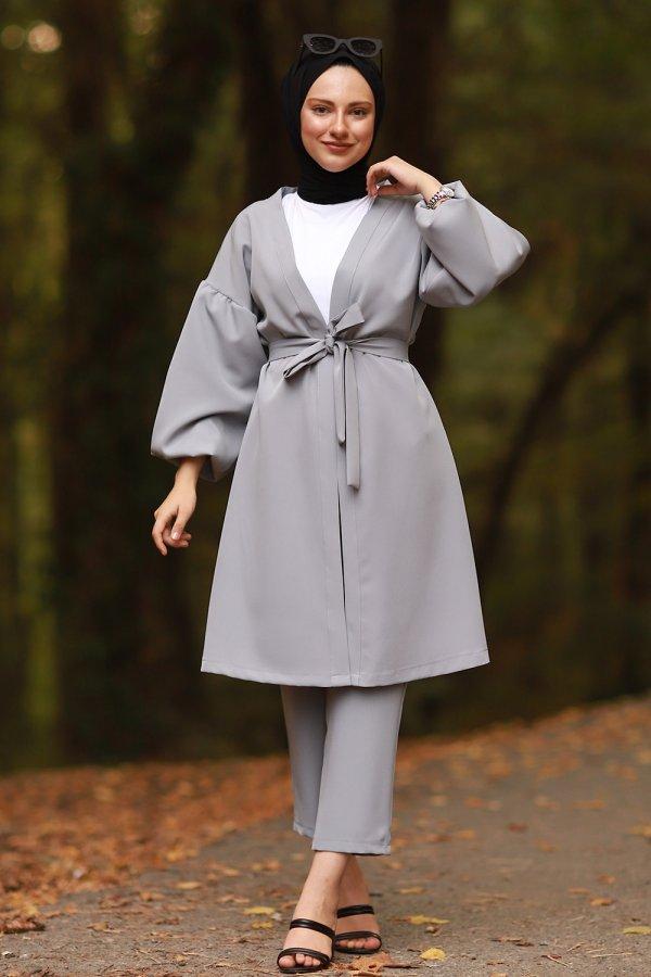 Balon Kol Kemerli Ceket Pantolon Tesettür Takım Gri