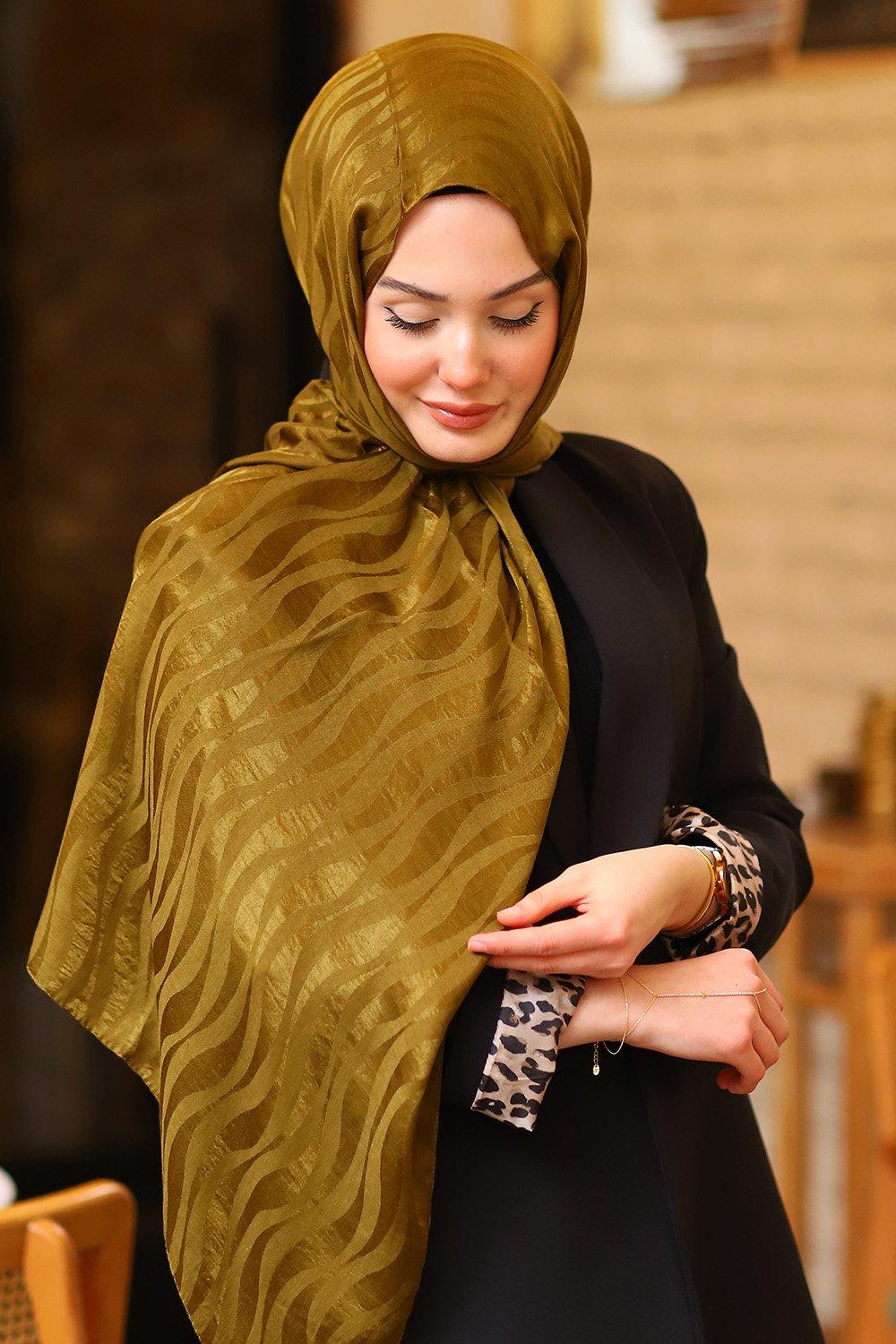Çift Taraflı İpeksi Pamuk Jakar Kumaş Dalga Desen Tesettür Şal Serisi Yağ Yeşili