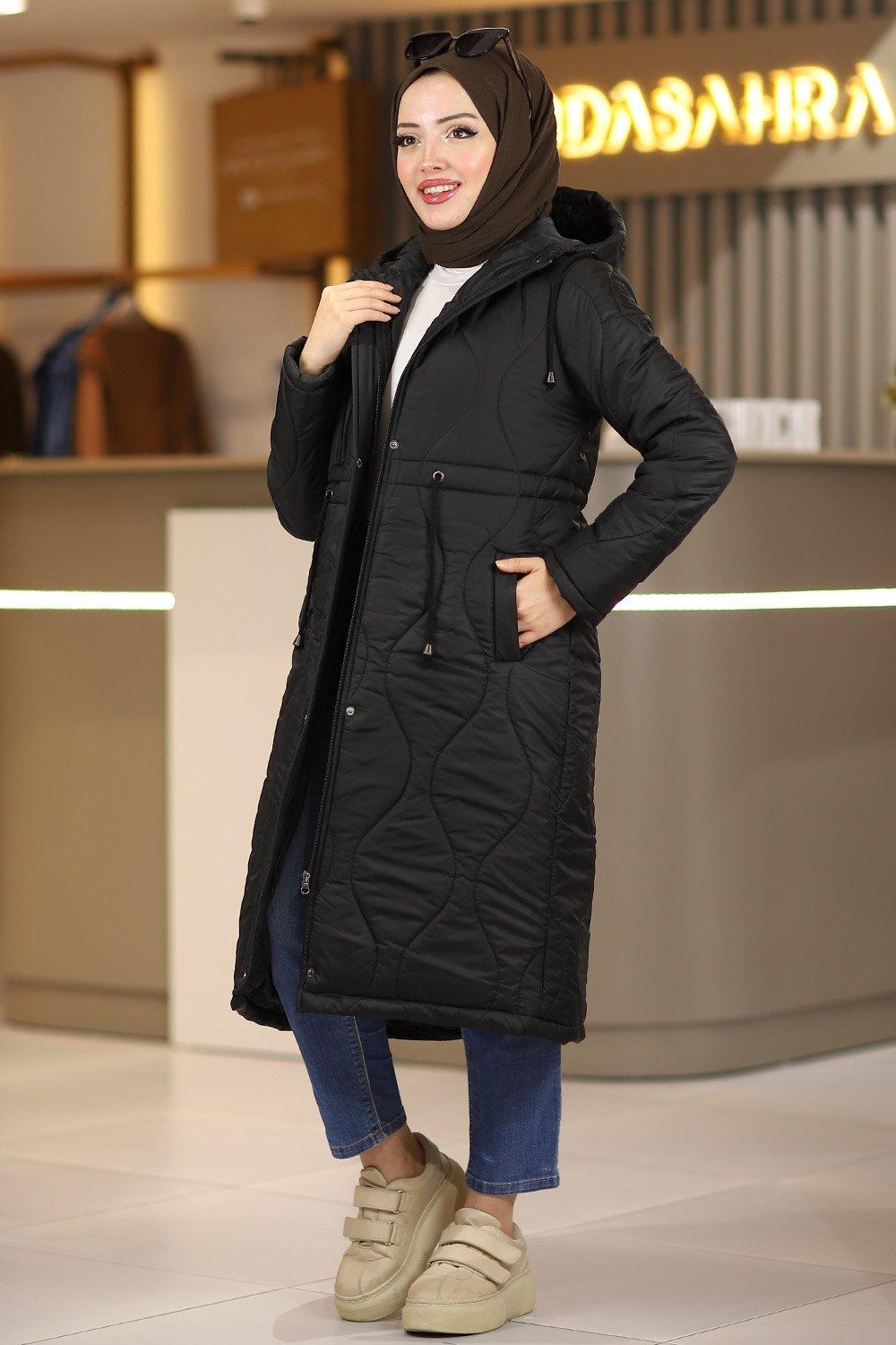 Çıtçıtlı ve Fermuarlı Kapitone Tesettür Mont Siyah