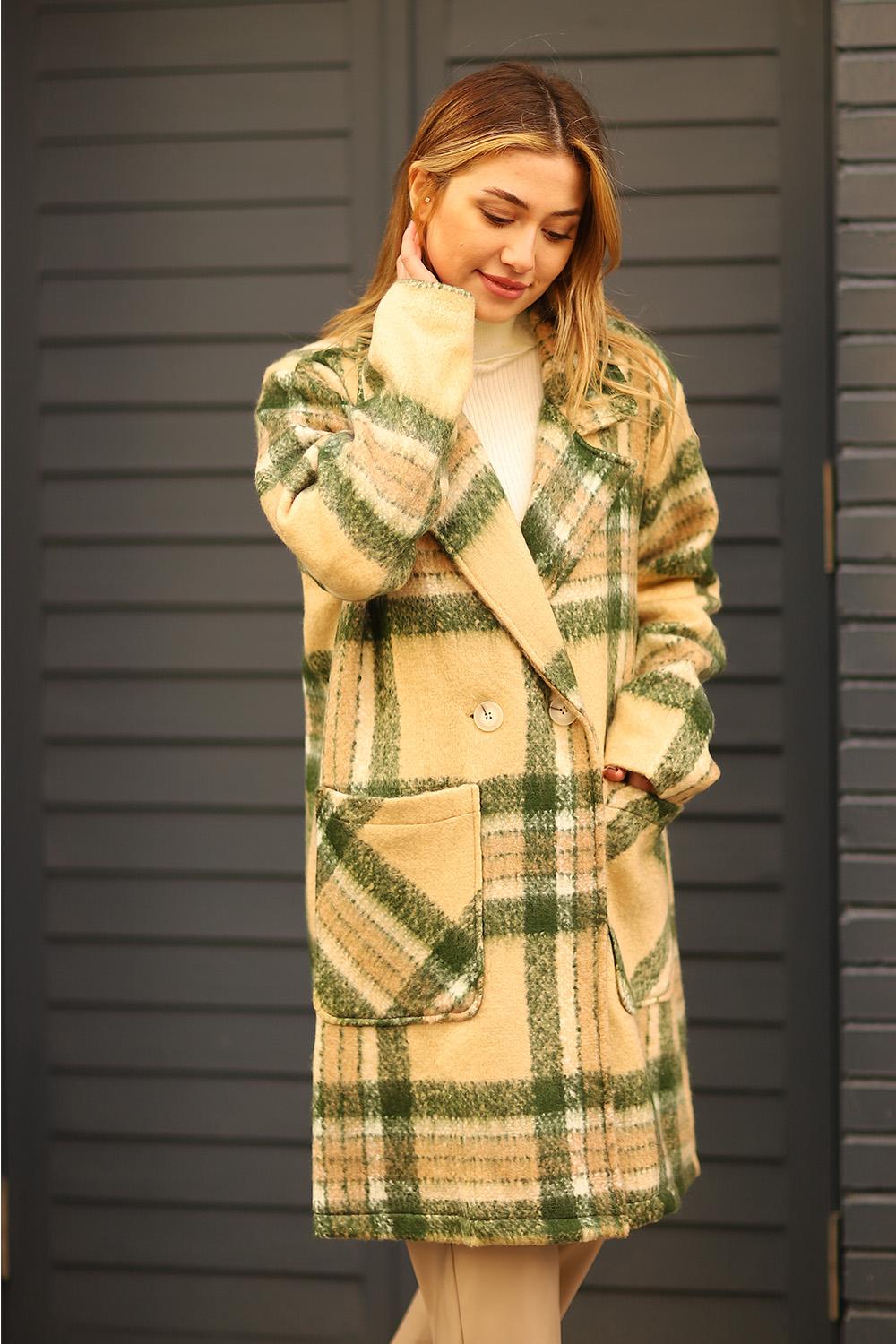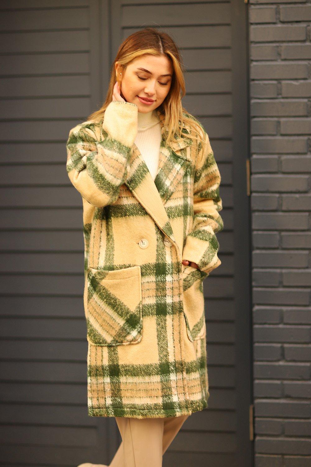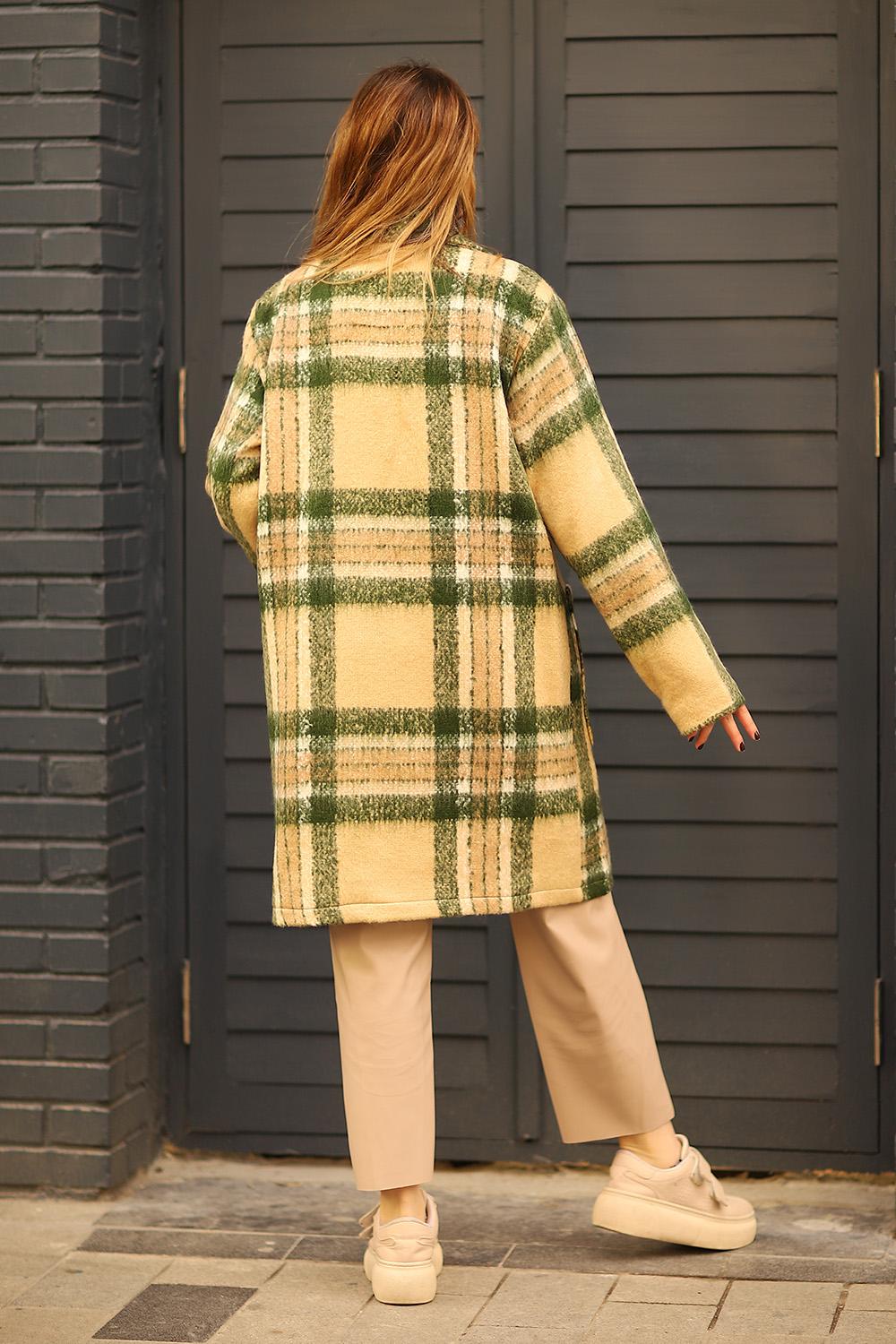 Düğmeli Tesettür Kaşe Kaban Zümrüt Bej