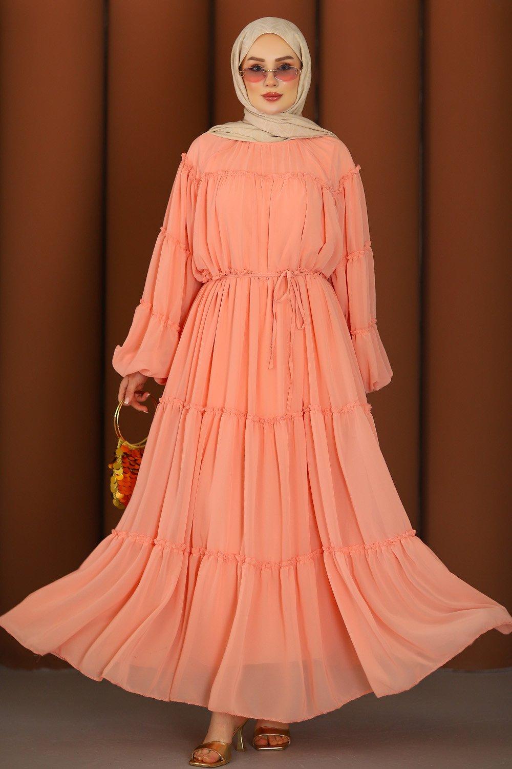 Fırfırlı Tesettür Elbise Pudra