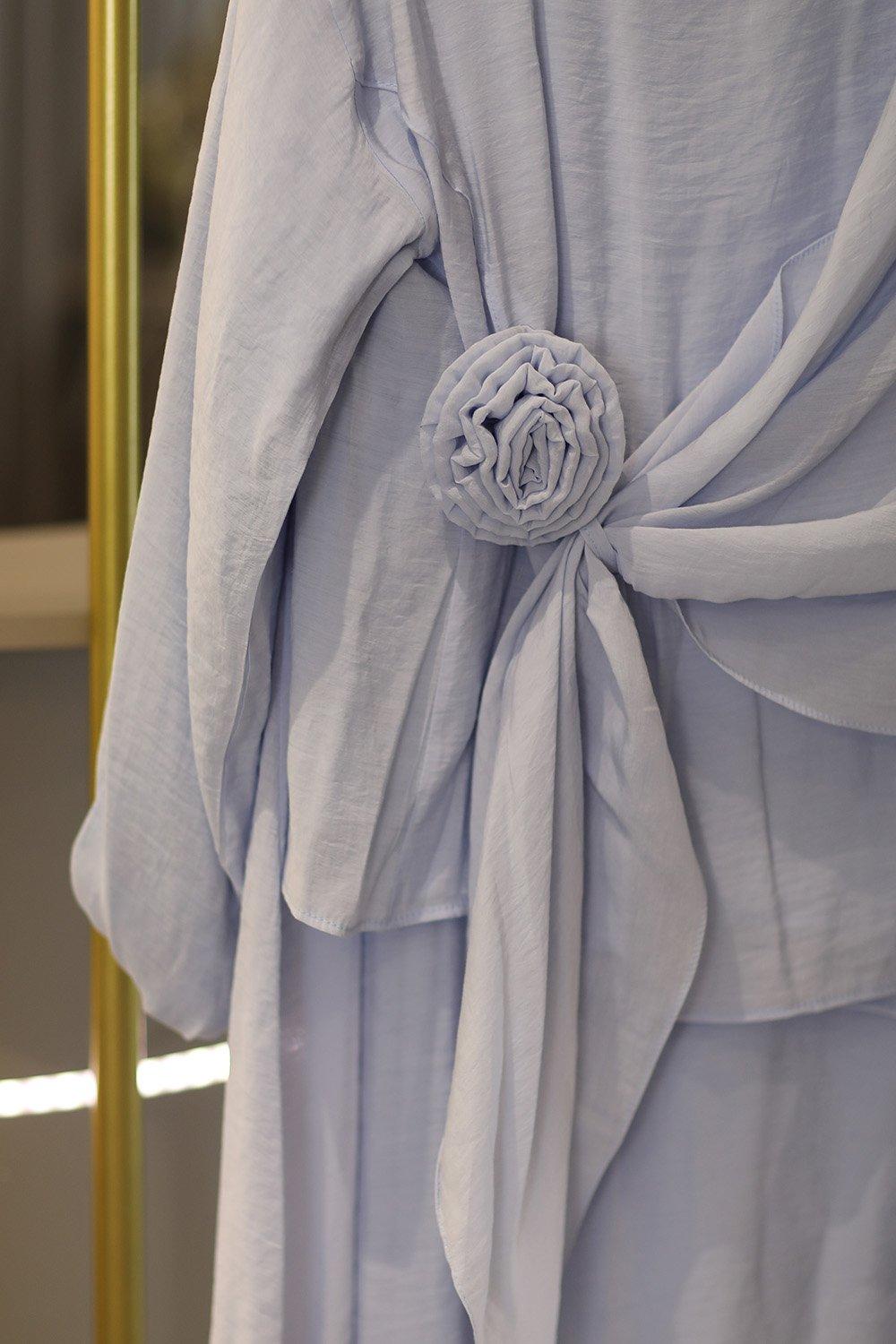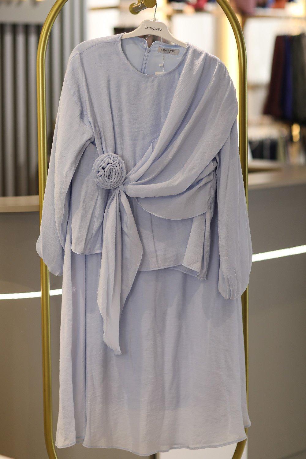 Gül Drapeli Tesettür Etekli Takım Mavi