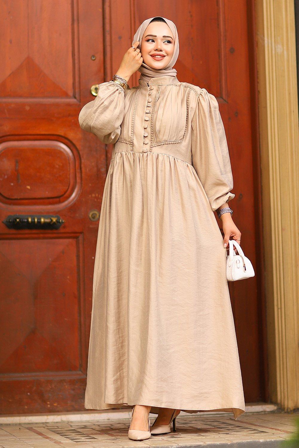 Güpür ve Düğme Detaylı Elbise Bej