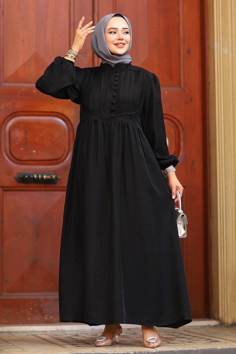 Güpür ve Düğme Detaylı Elbise Siyah