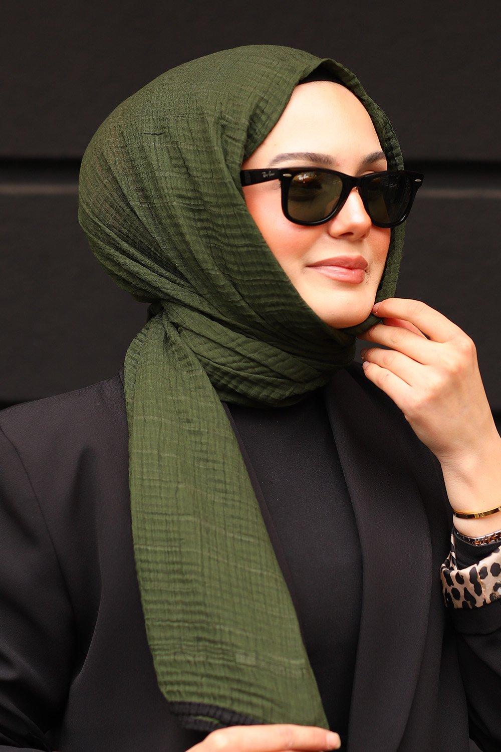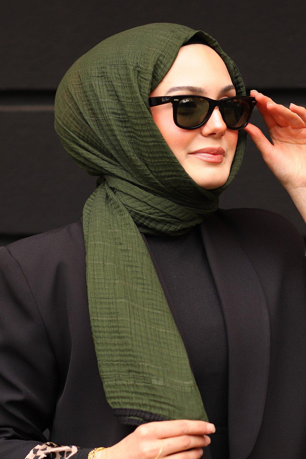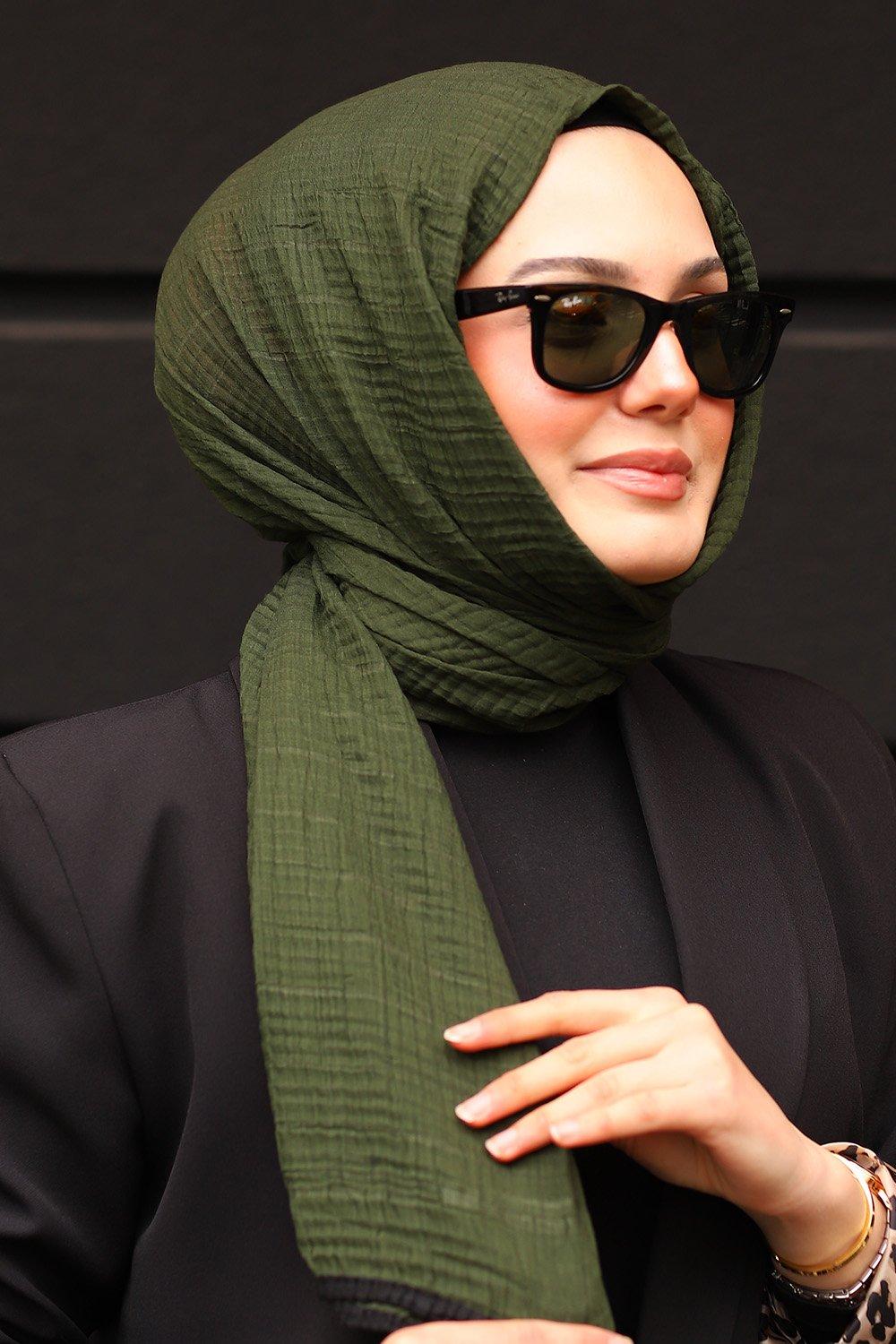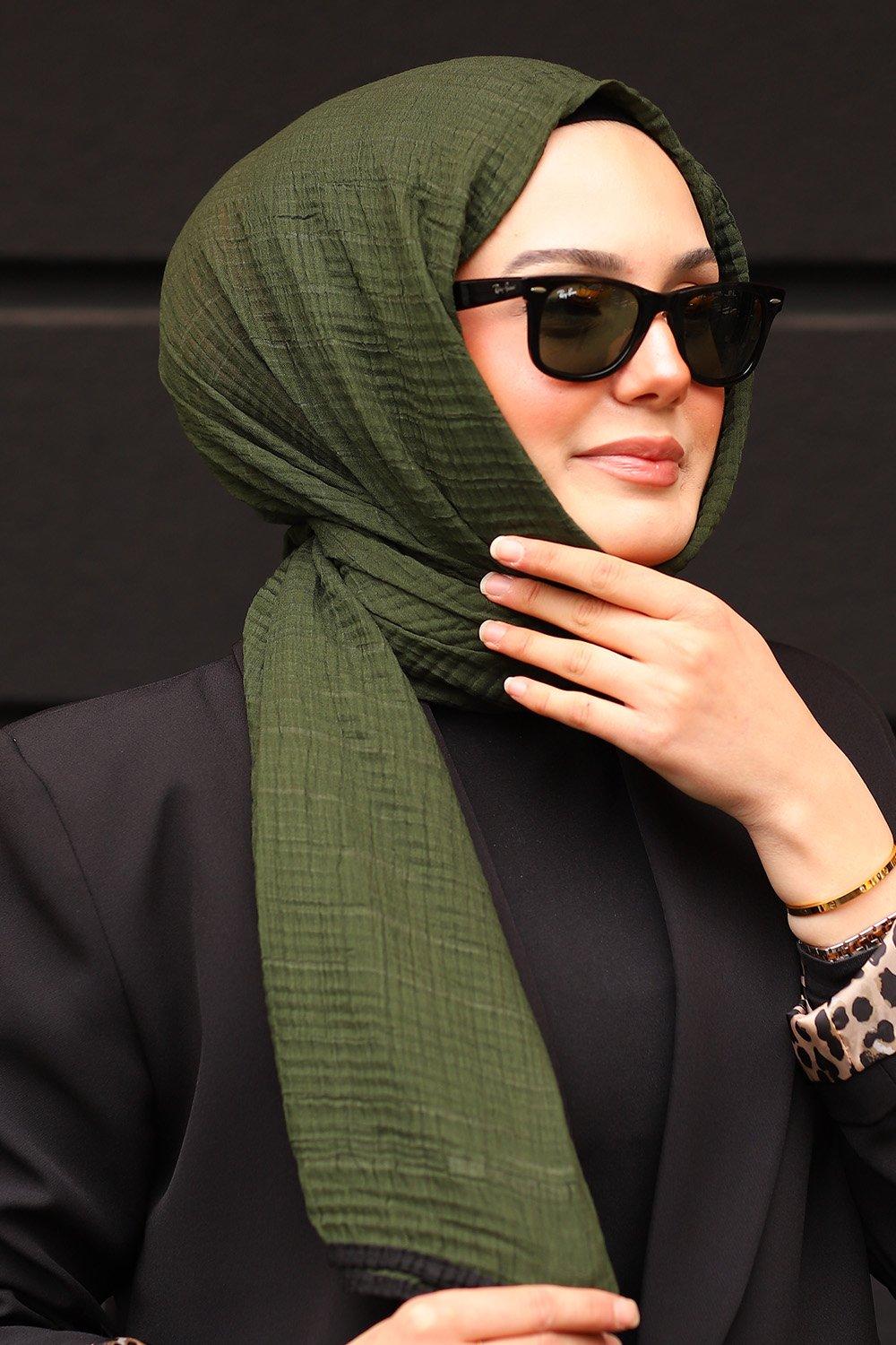 Haki Siyah Premium Müslin Biyeli Şal