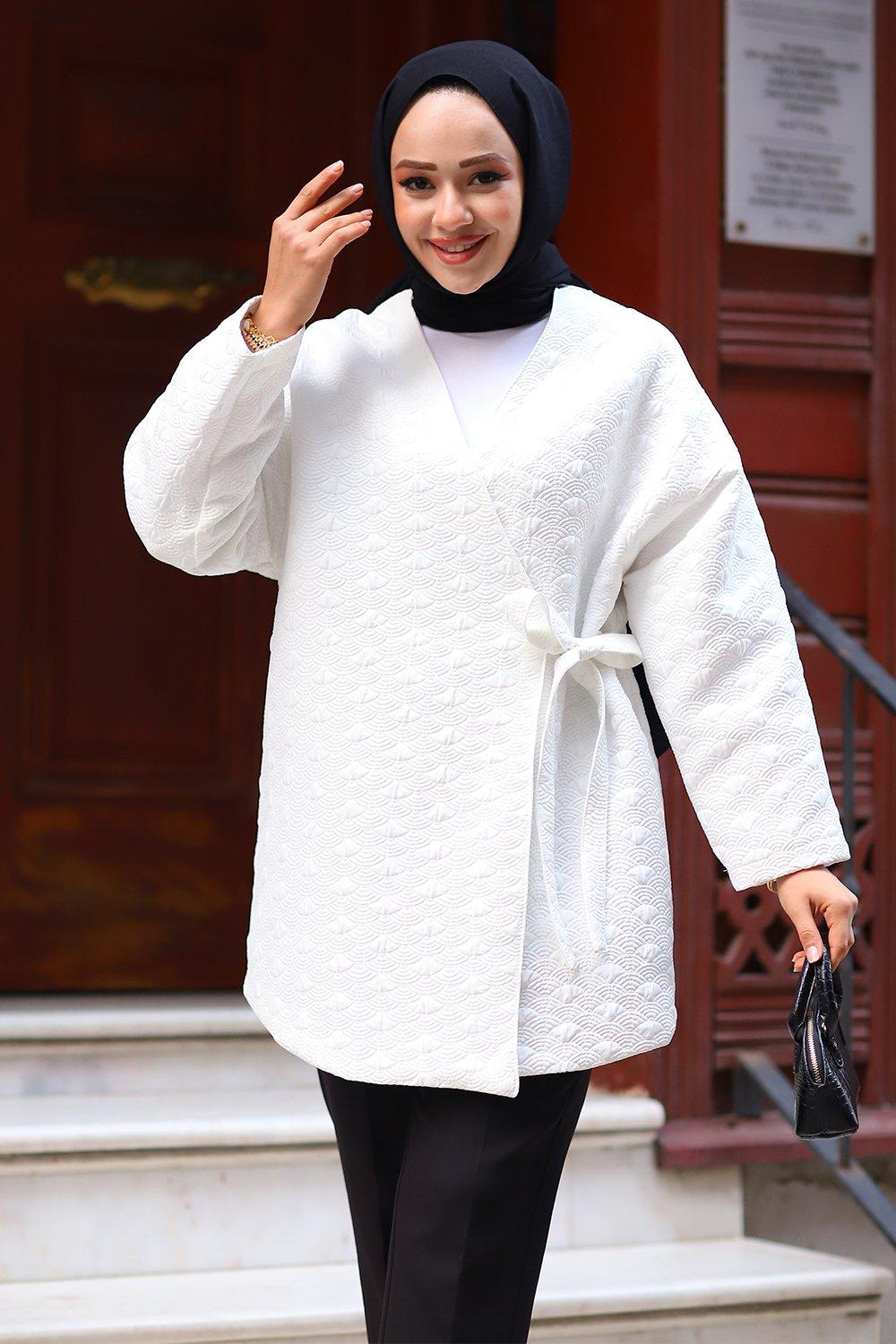 Kapitone Astarlı Bağlamalı Ceket Beyaz
