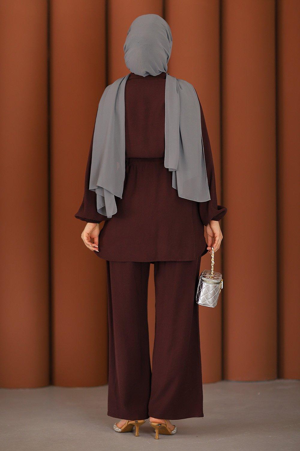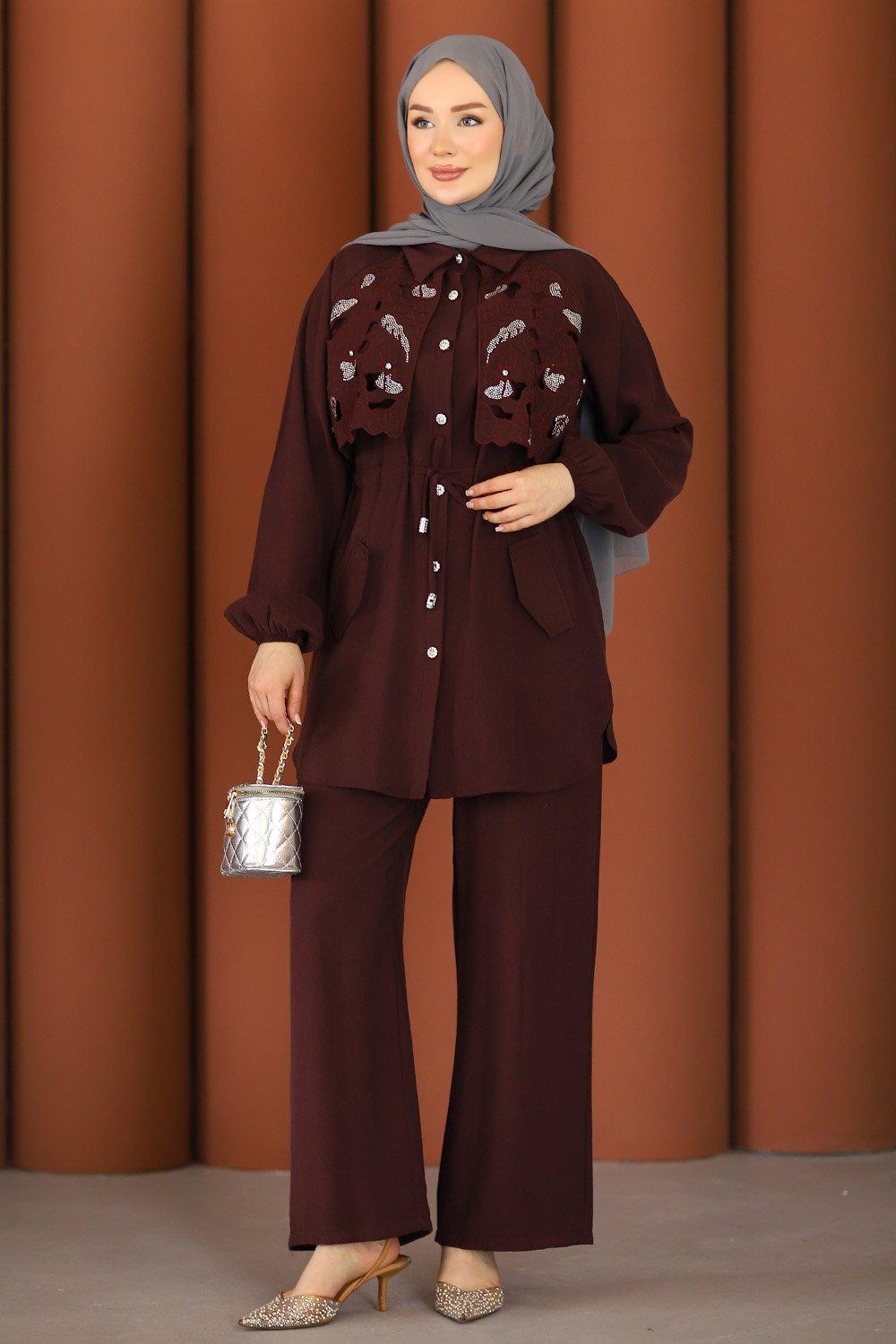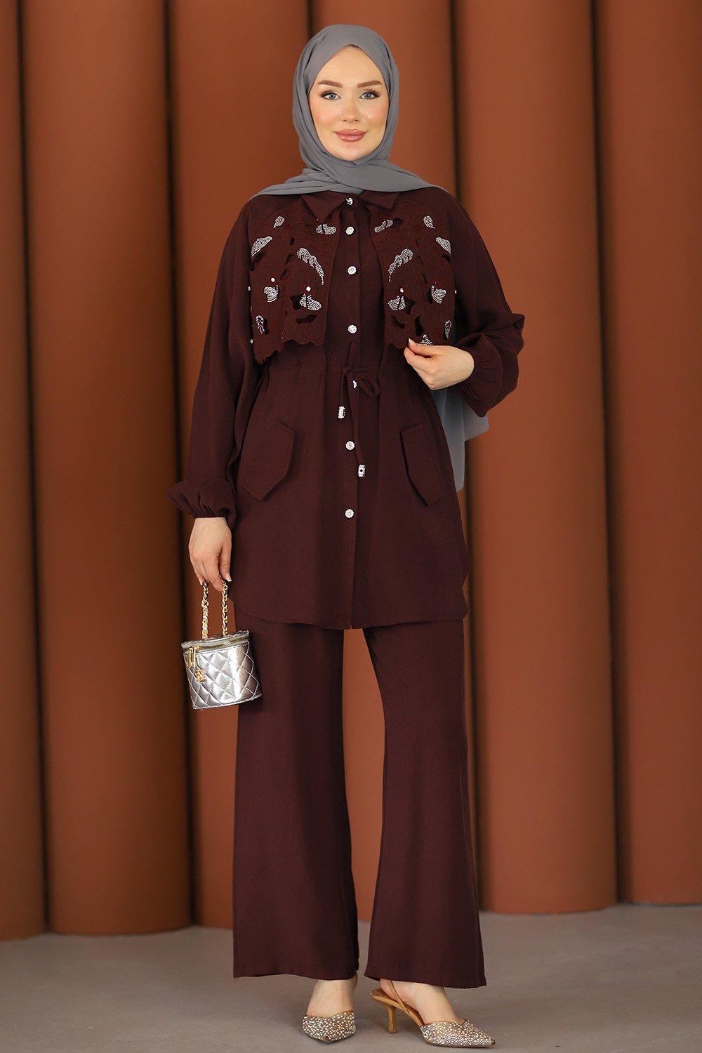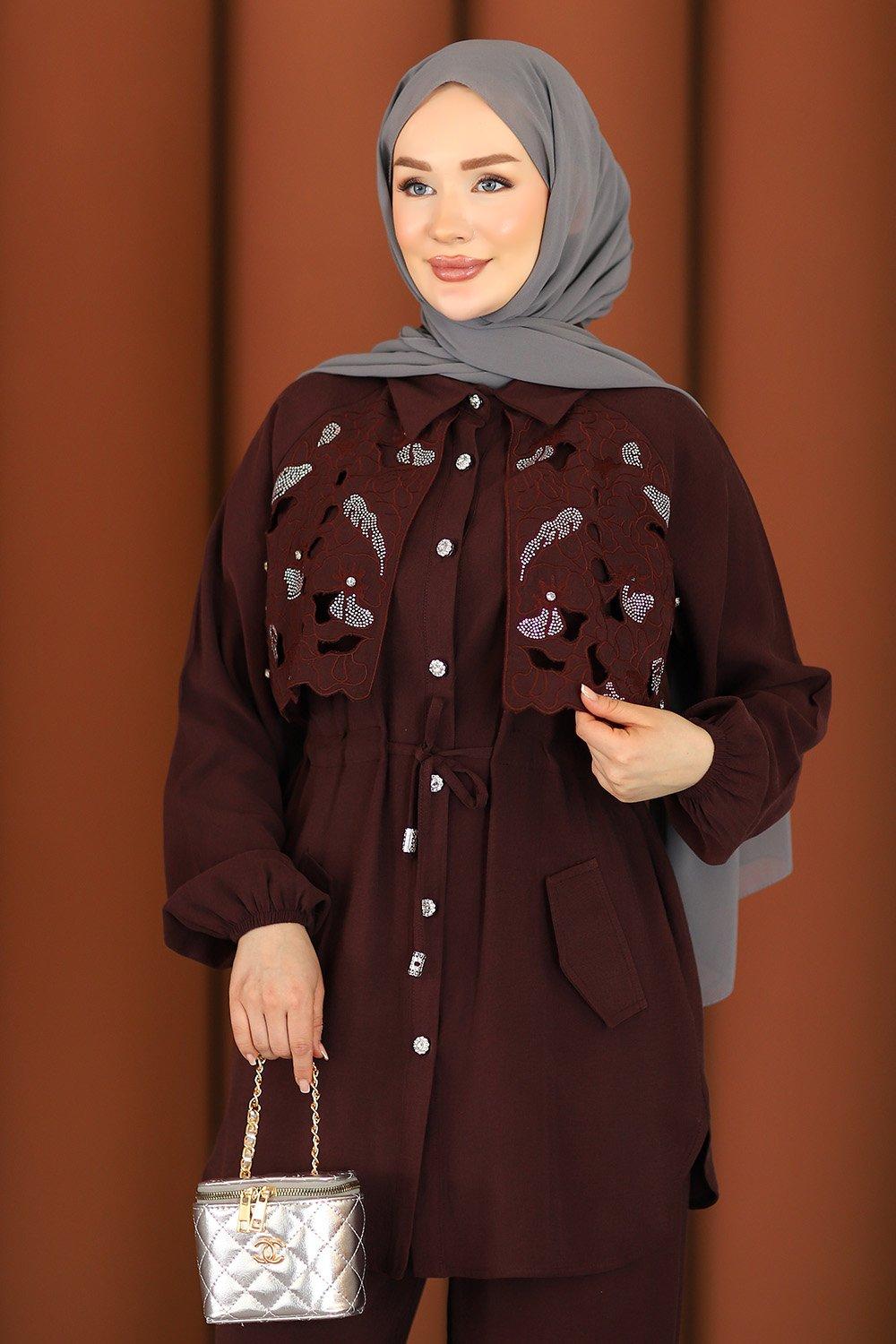 Premium Işıltılı Güpürlü Taşlı Tesettür Takım Mürdüm