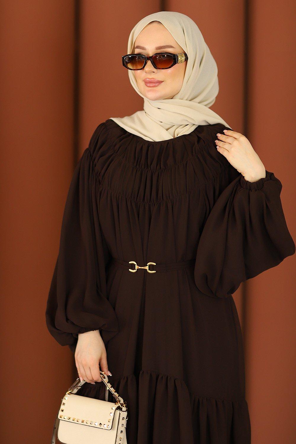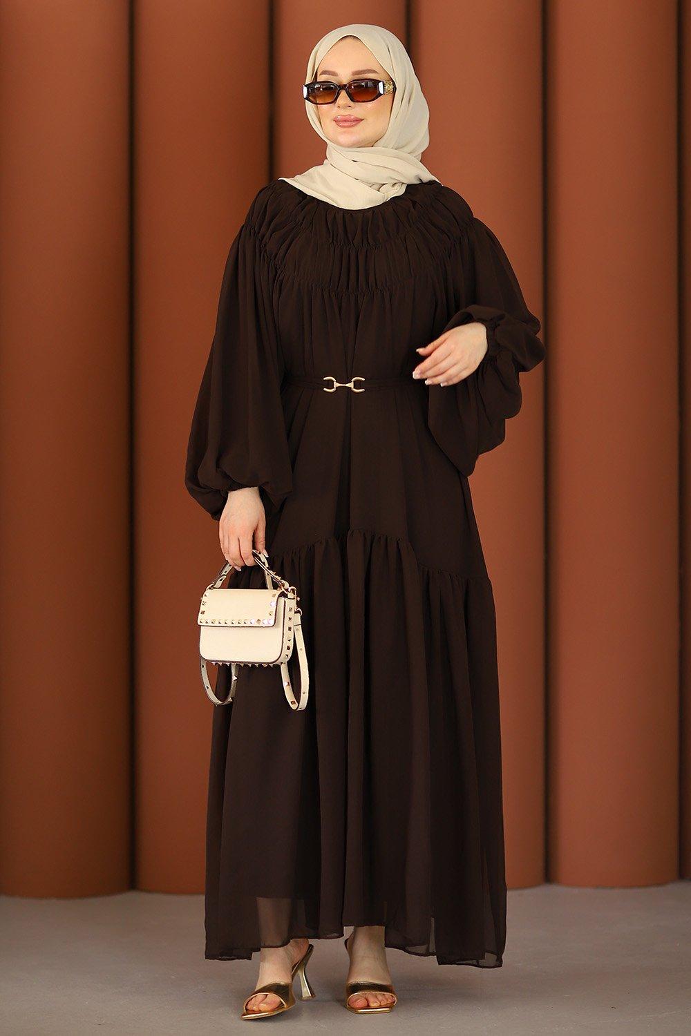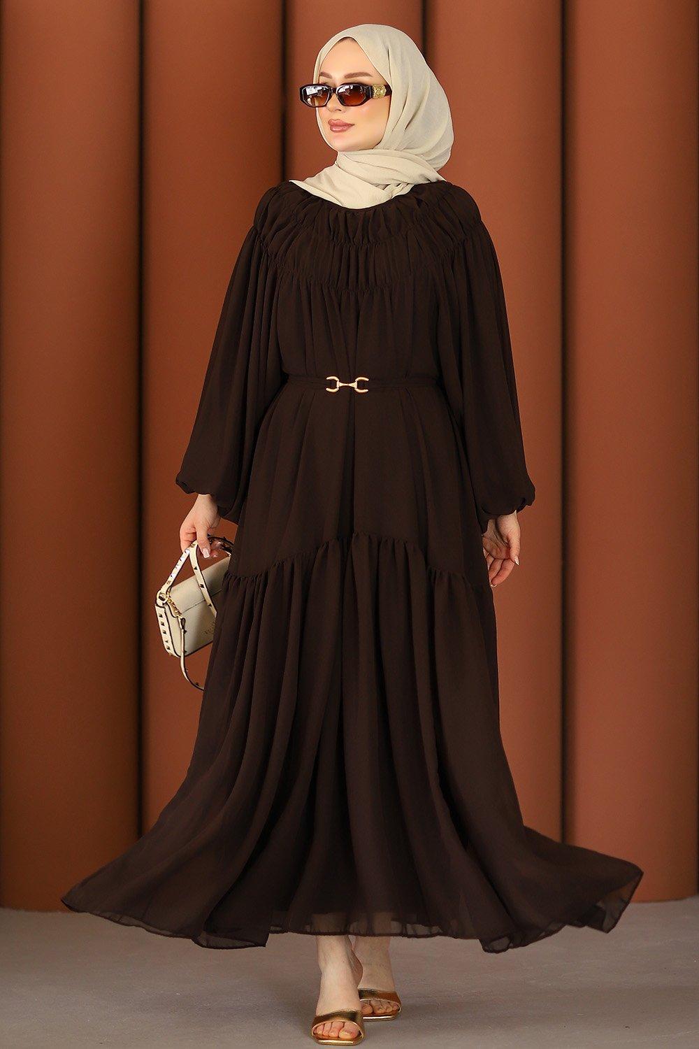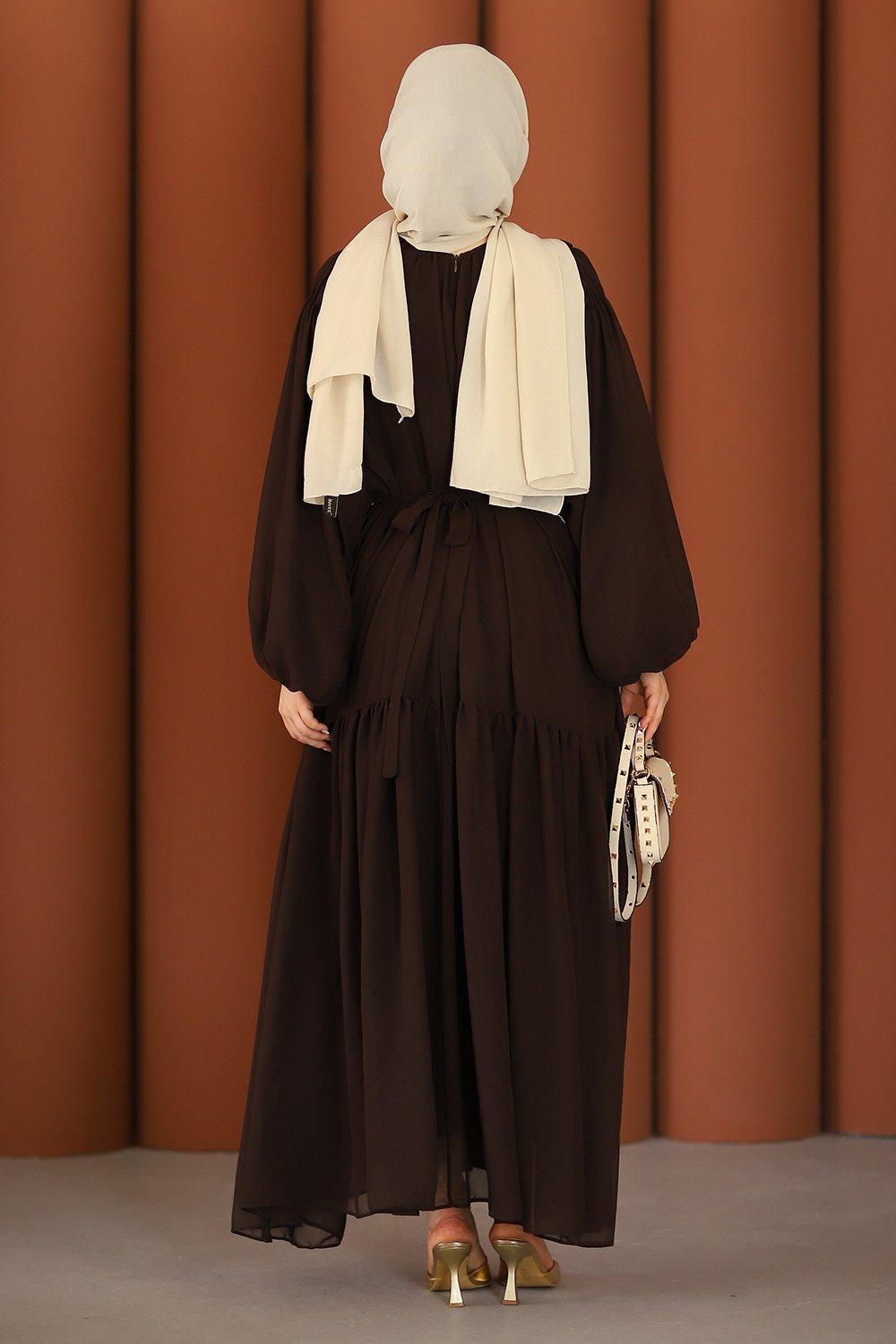 Premium Işıltılı Şifon Tesettür Elbise Acı Kahve