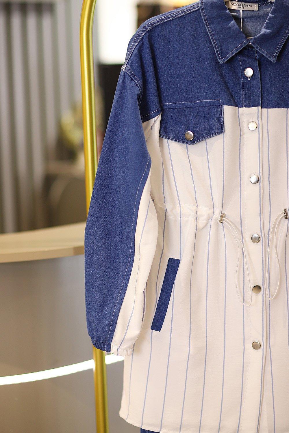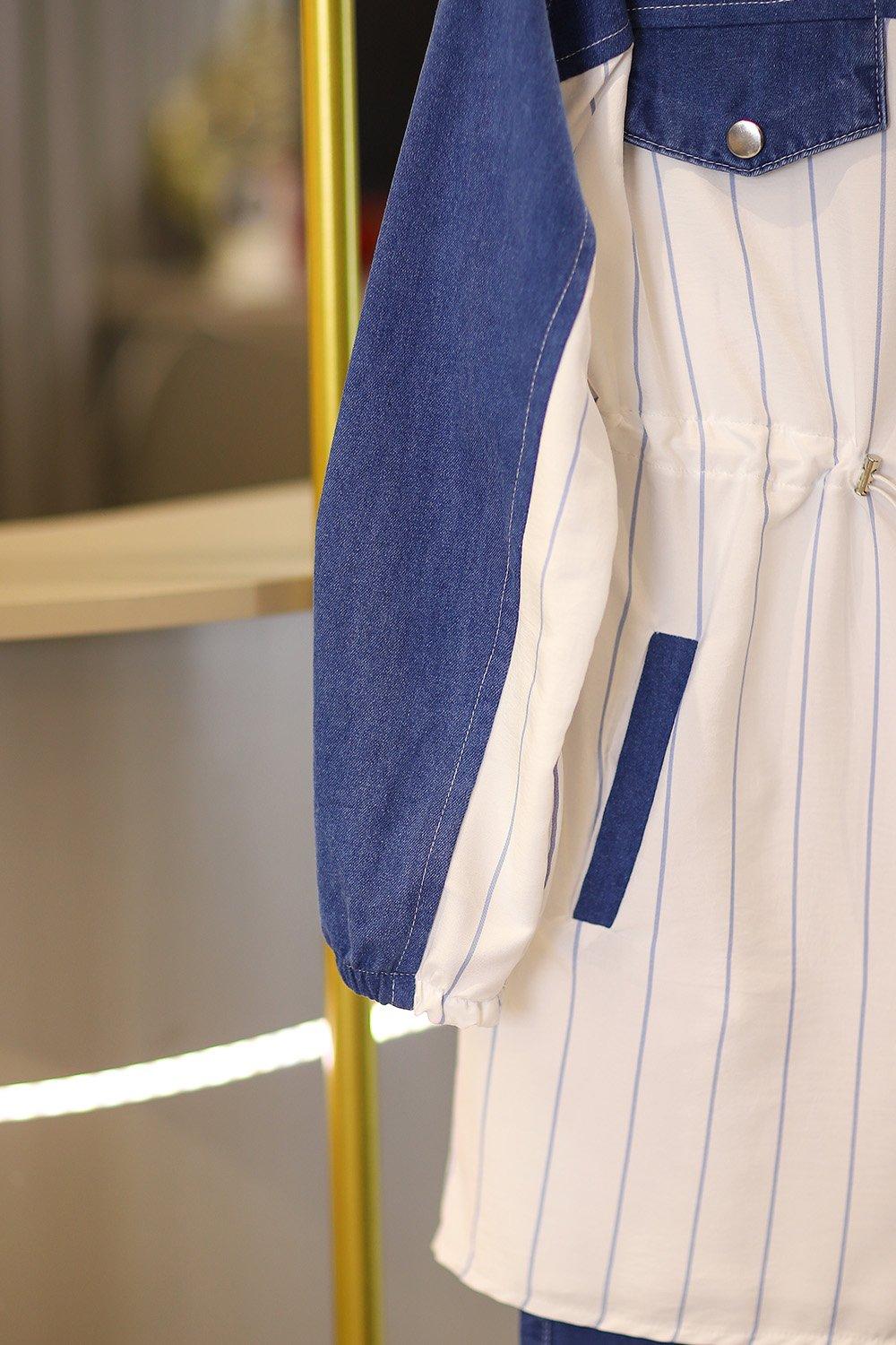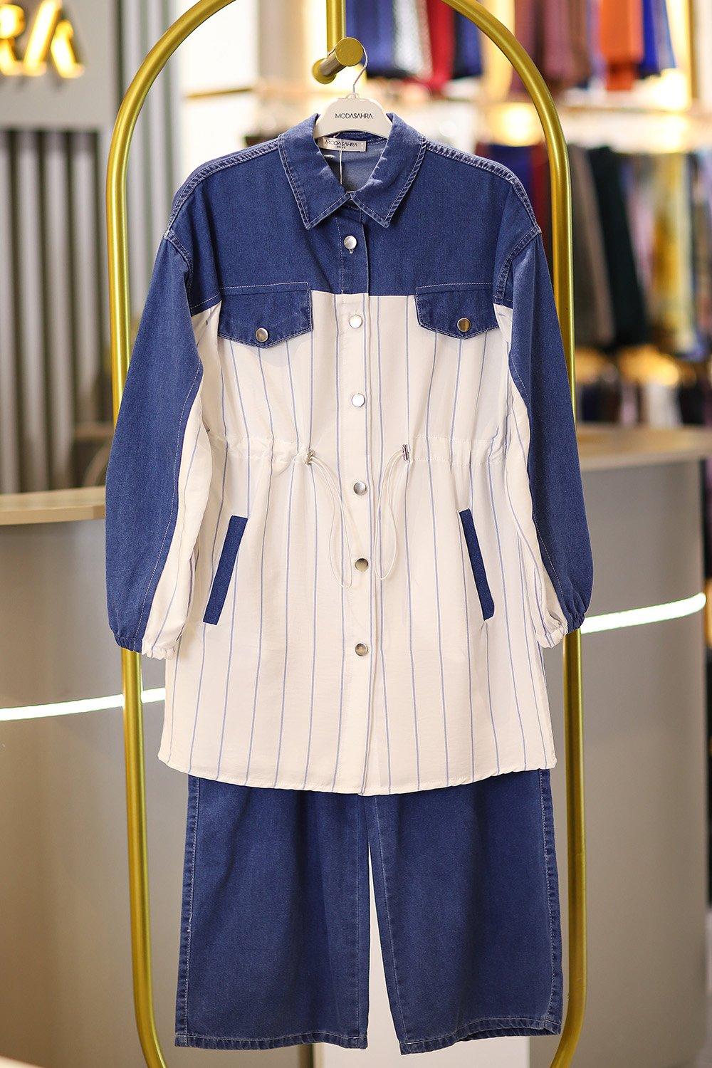 Premium Kalite Çizgili Kot Tesettür Takım Orta Lacivert