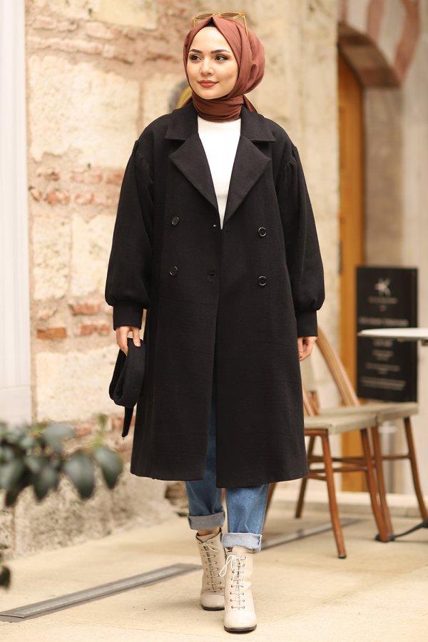 Premium Kalite Uzun Boy Kuşaklı Balon Kol Kaşe Tesettür Kaban Siyah