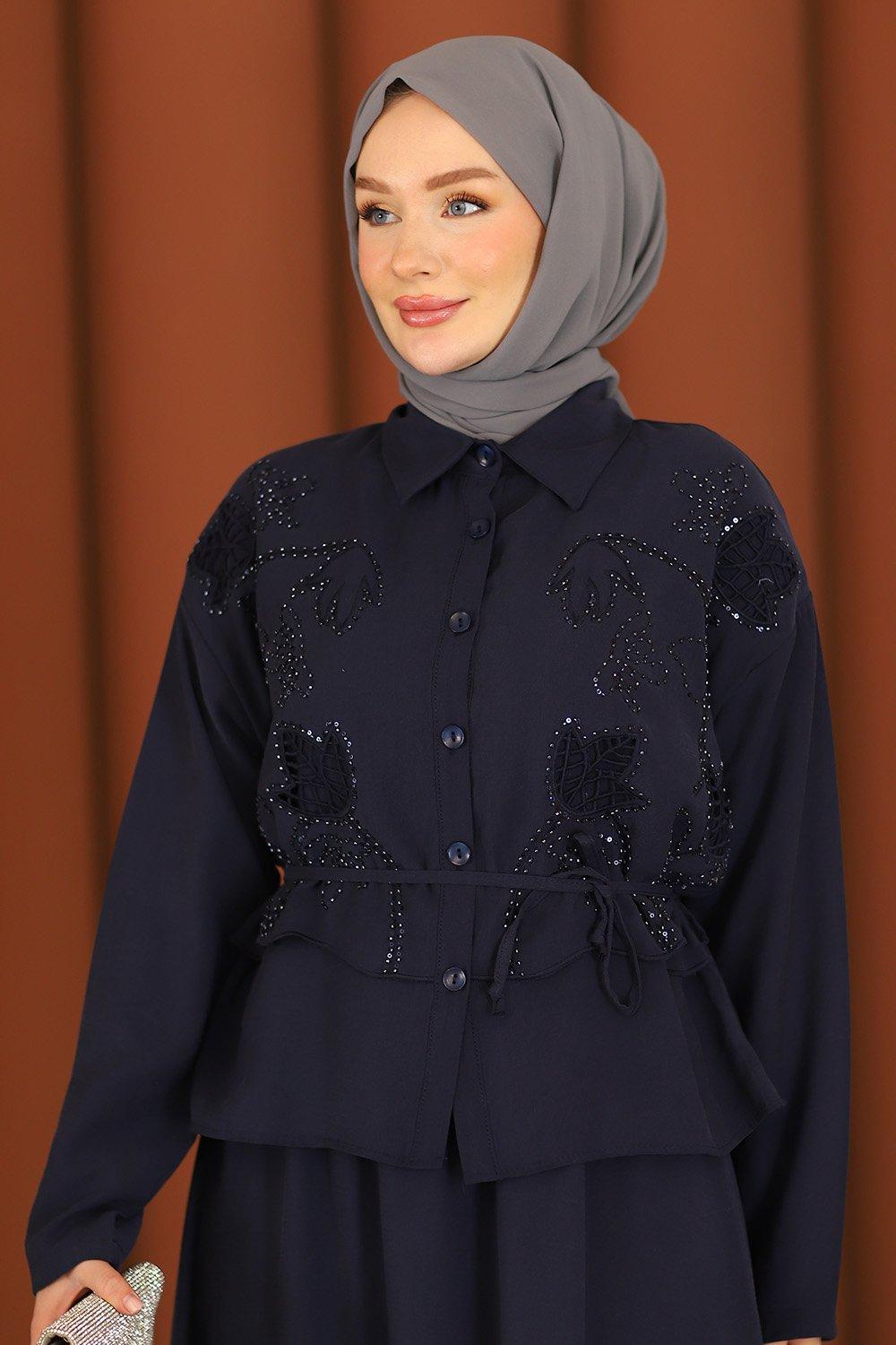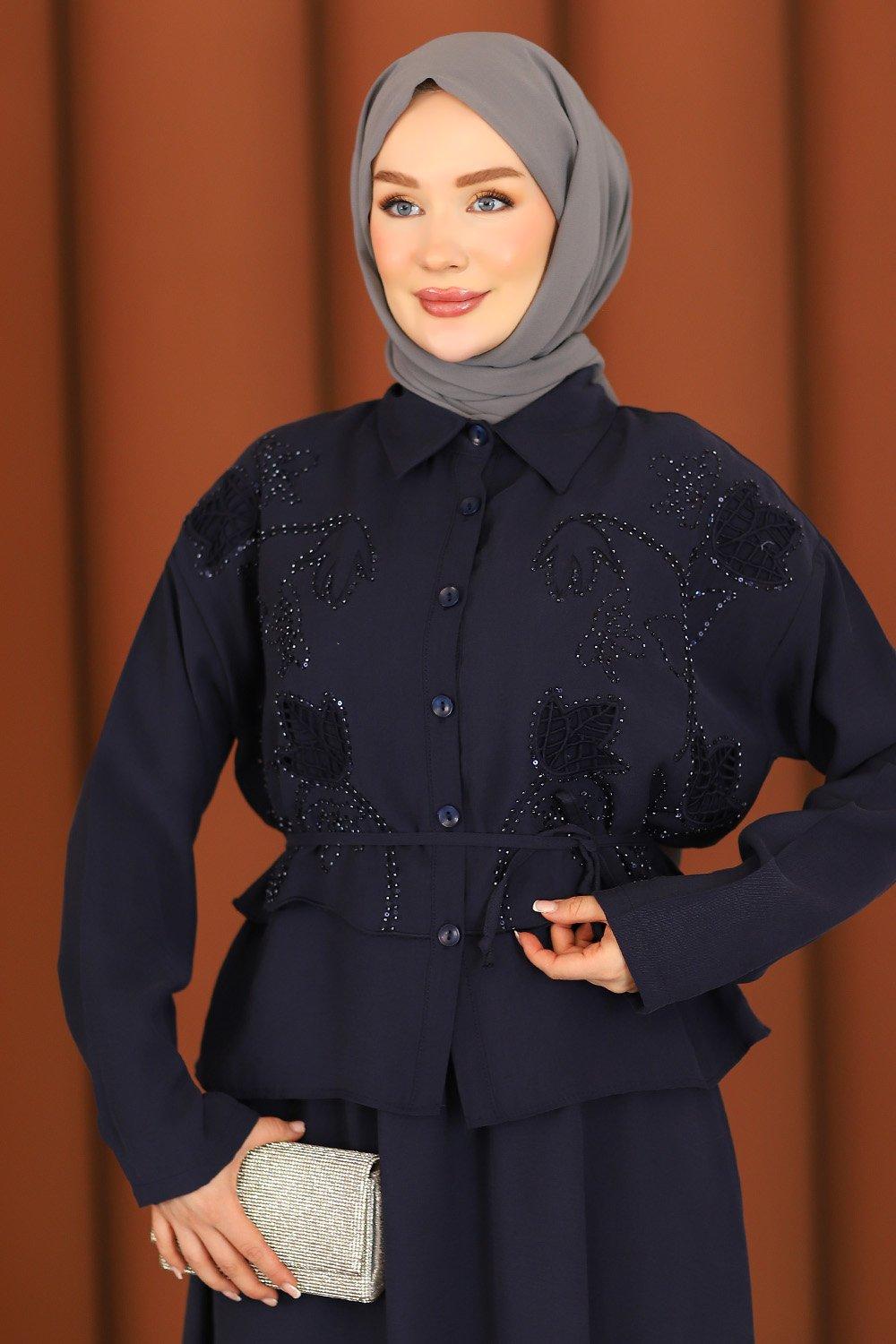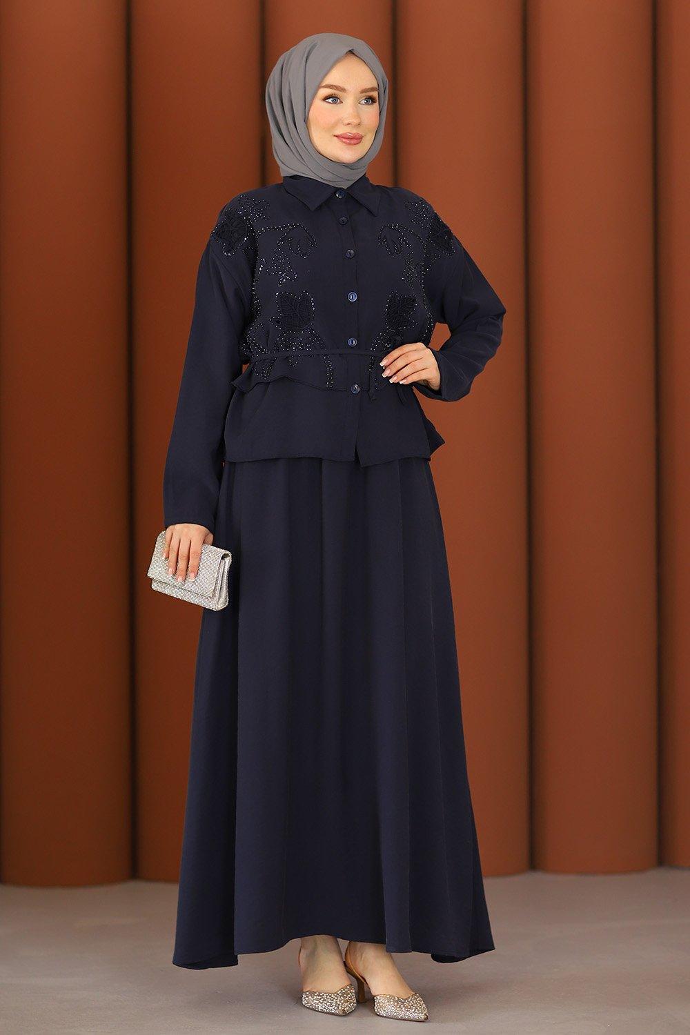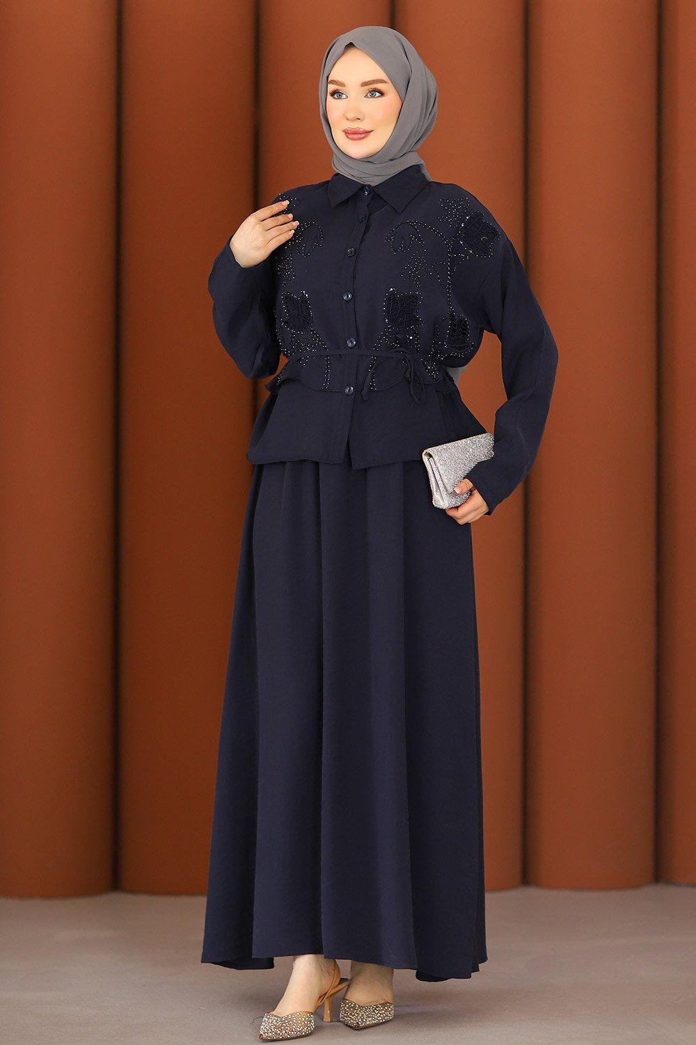 Premium Nakışlı Şık Tesettür Etekli Takım Lacivert