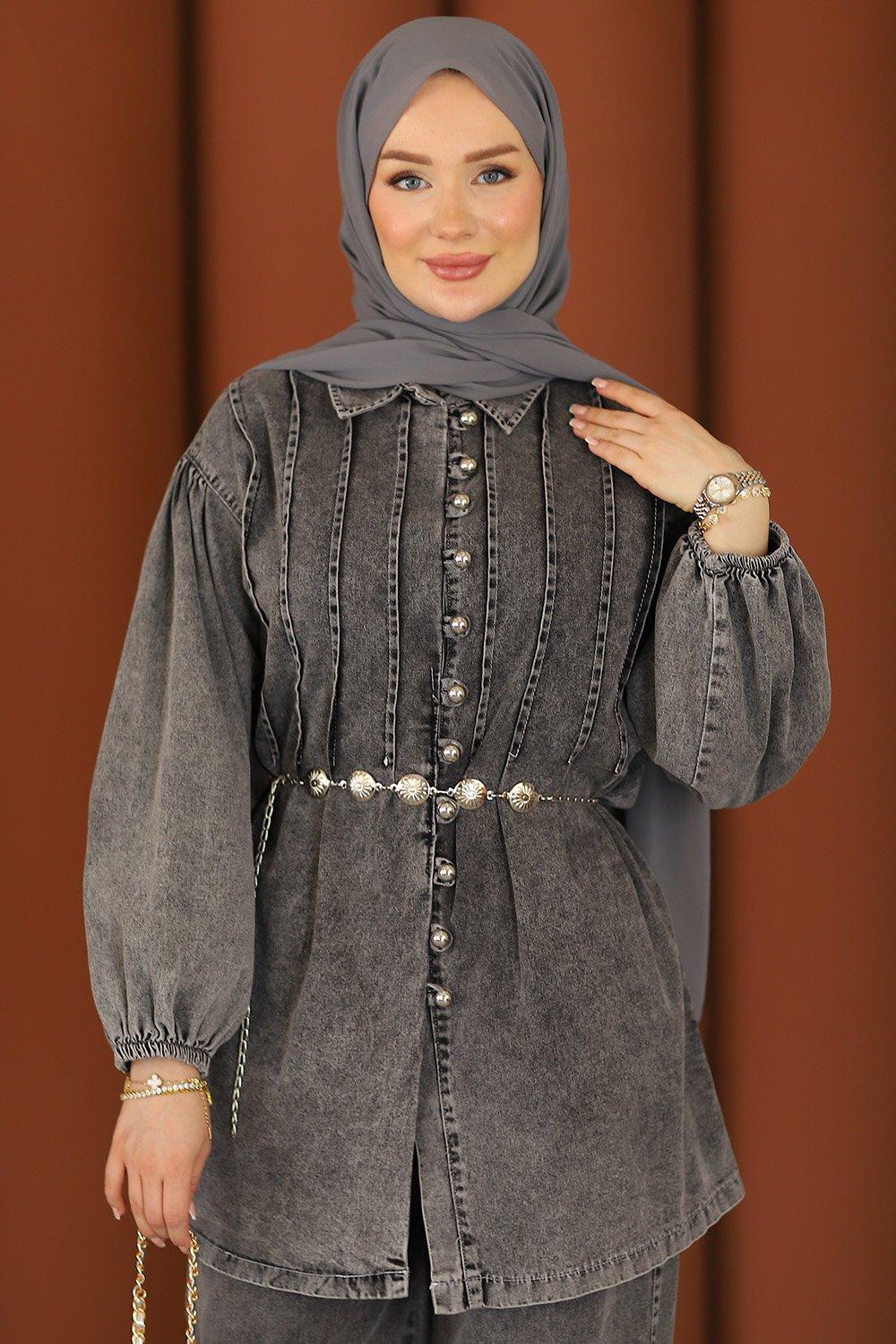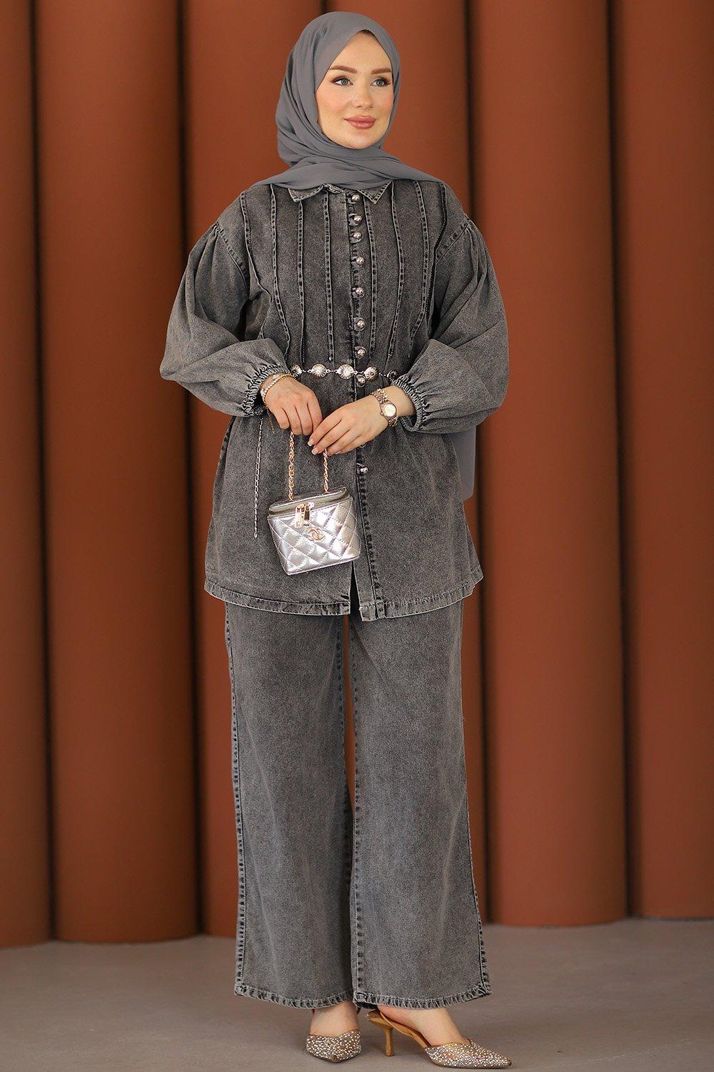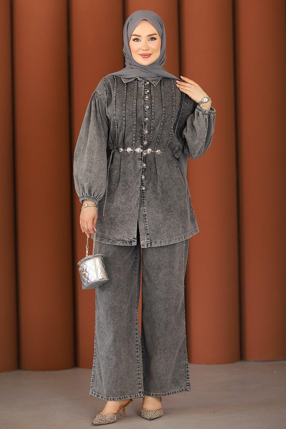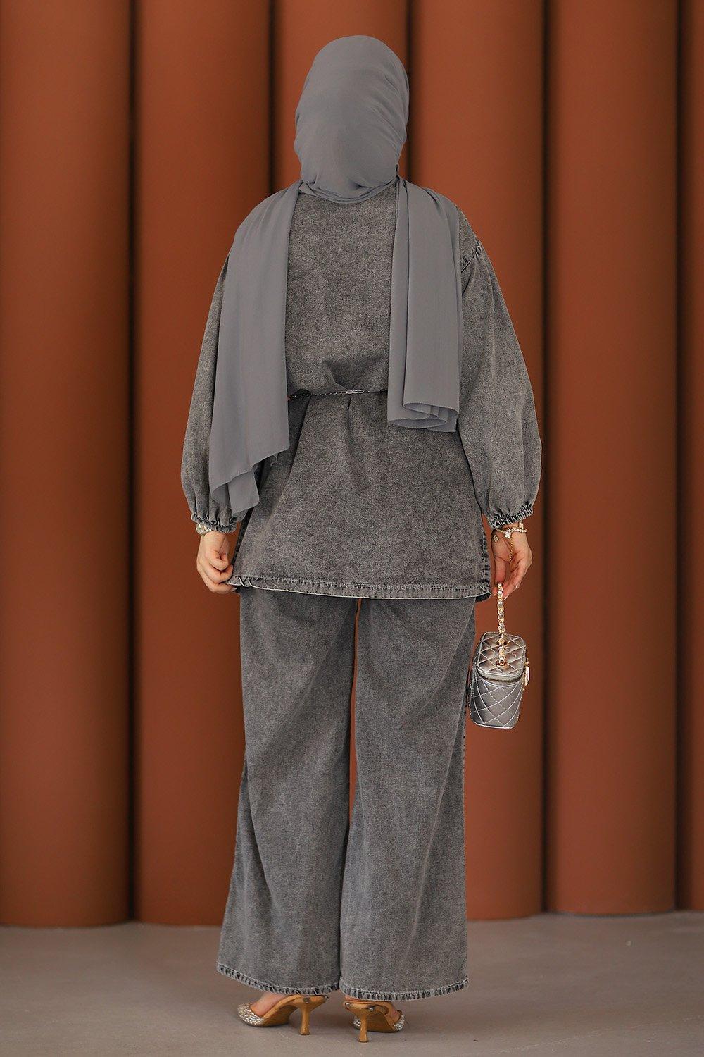 Premium Pileli Kemerli Kot Takım Gri
