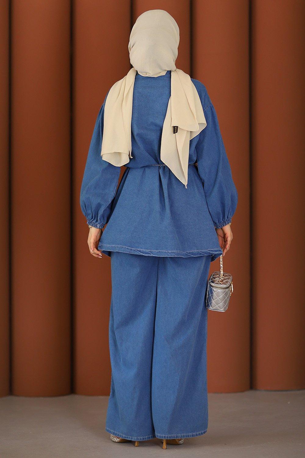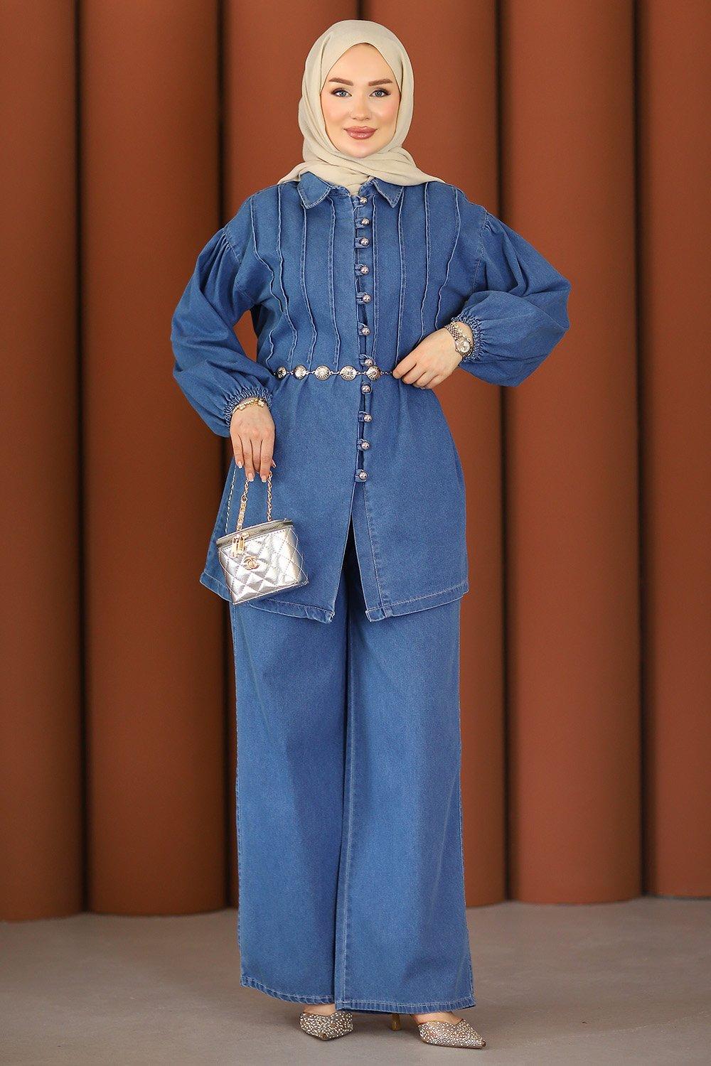 Premium Pileli Kemerli Kot Takım Orta Mavi