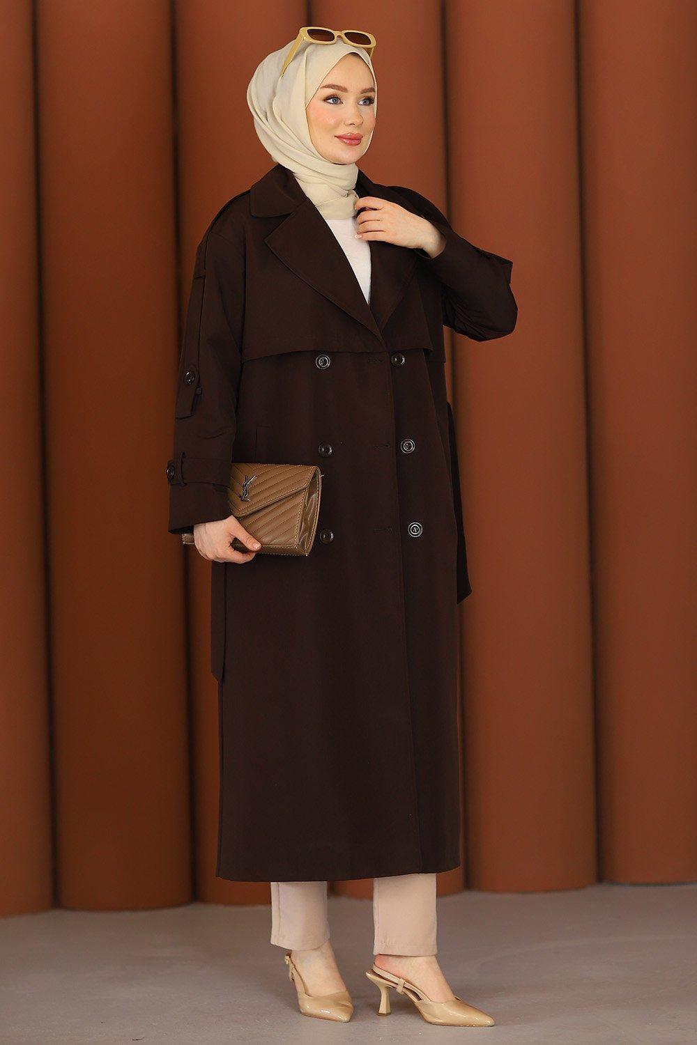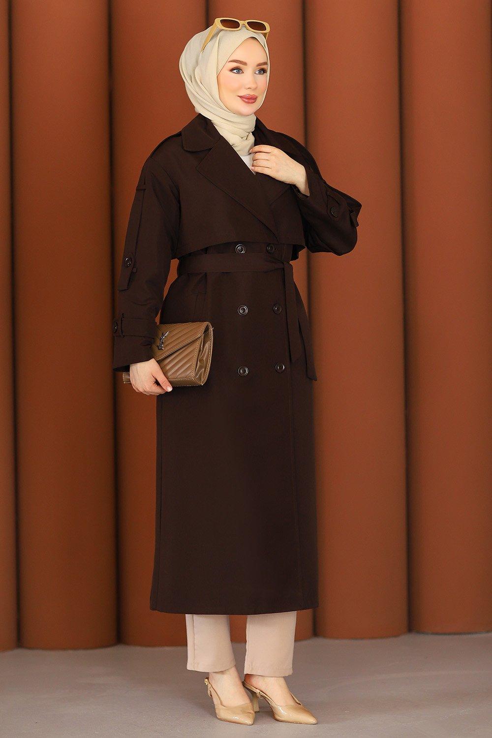 Premium Sahra Tesettür Trençkot Acı Kahve Koyu