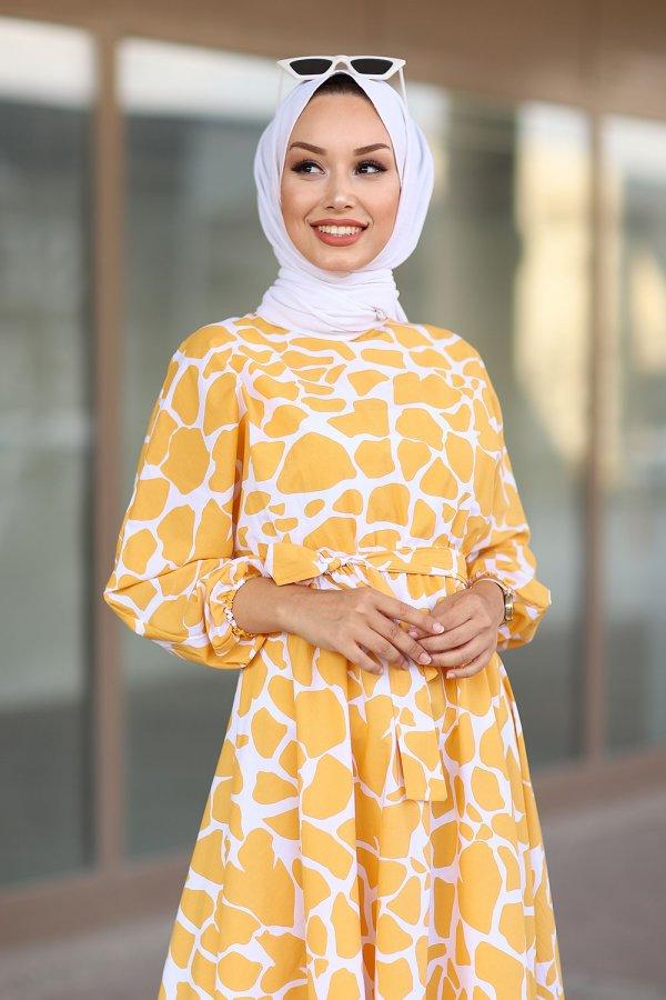 Zebra Desen Kuşaklı Tesettür Elbise Sarı